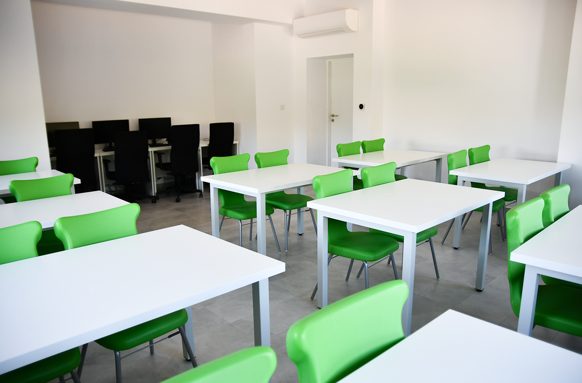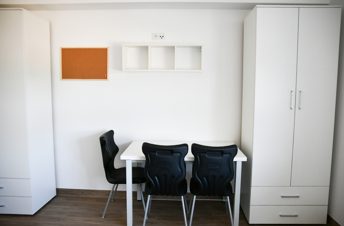 W strefach wspólnych i jadalni zastosowaliśmy nowoczesne, ergonomiczne krzesła oraz przestronne stoły, idealne do nauki w grupach i wspólnego spędzania czasu. Dodatkowo, jasne kolory wnętrza oraz zielone akcenty na krzesłach wprowadzają świeżość i optymizm, sprzyjając koncentracji i dobremu samopoczuciu mieszkańców.